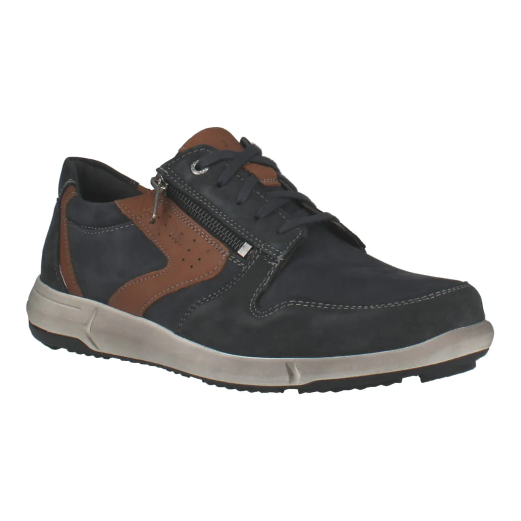 New to the collection, JOSEF SEIBEL Enrico 20: a men’s casual shoe in smooth and nubuck leather with an asymmetrical functional zip and a distinct white sole.