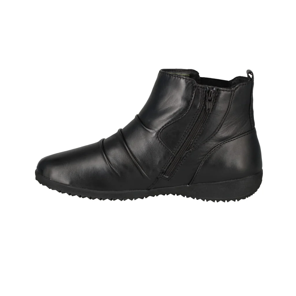 JOSEF SEIBEL Naly 60 is a soft leather ruched ankle boot with a rounded toe design. This short pixie style has an elasticated gusset and side zip for easy on-off. Designed with practicality in mind its low wedge sole will elevate your stride, whilst offering stability. Crafted from high quality leathers with a cushioned footbed. Naly 60 is the perfect style to dress up or down. Wear them to the office with smart tailoring or teamed up with a pair of your favourite weekend denims.